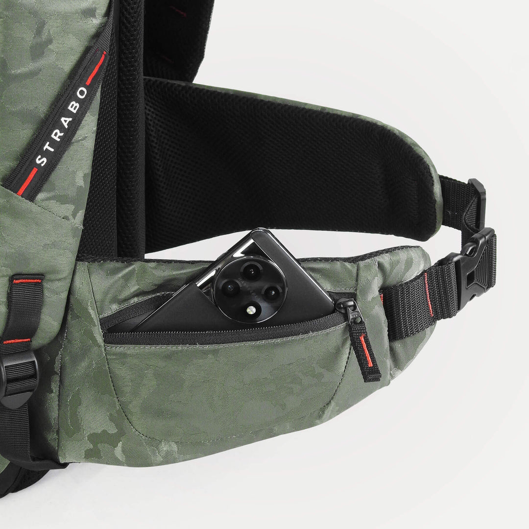 A padded, adjustable waist belt transfers weight to your hips, alleviating strain on your shoulders and back, with a pocket for essentials.